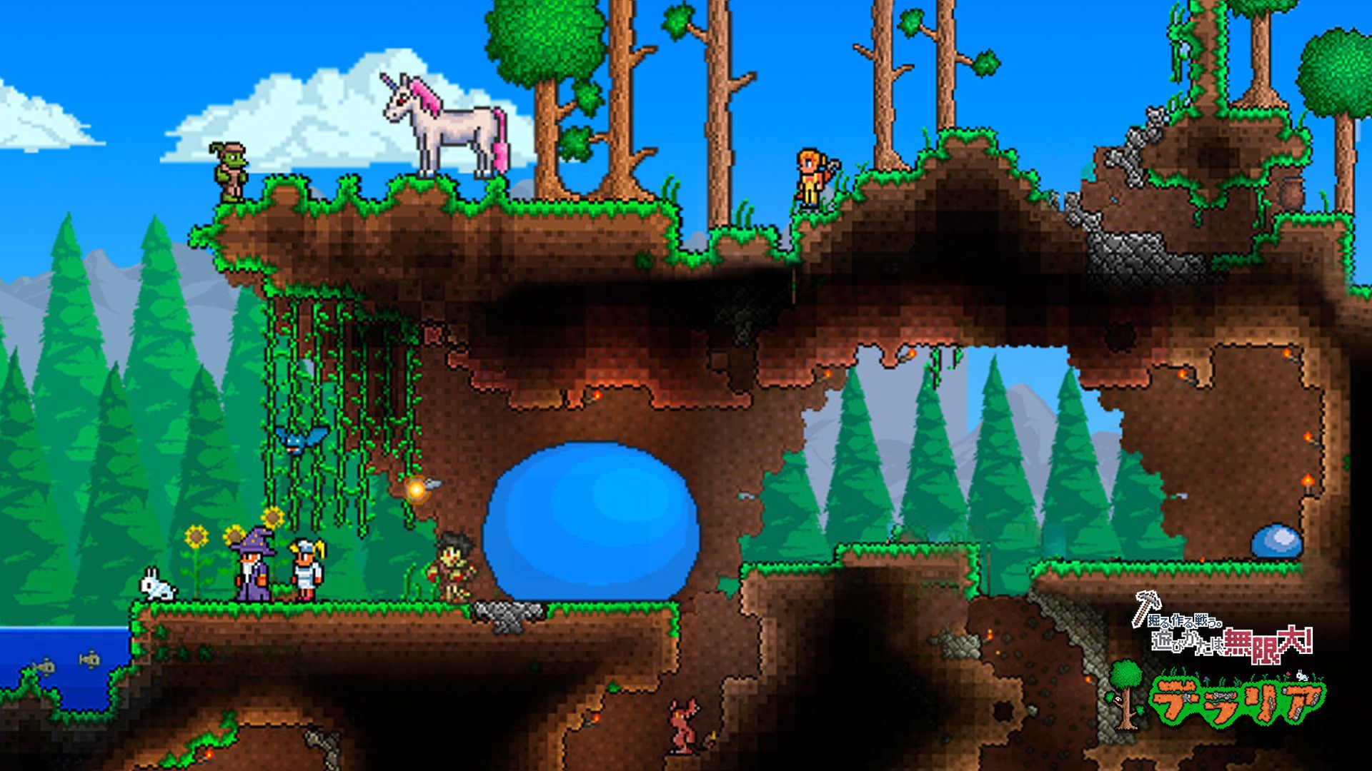 テラリアの世界は木や土、鉱石などのブロックで構成されており、つるはしやオノ等を使って切り崩すことで、素材として収集できる。 集めたブロックやモンスターが落とす素材などを使えば、アイテムを作ったり、自由な形の建造物を建てることが可能。 新たな素材を求めて、そしてまだ見ぬ敵を求めて広大なマップを自由に散策しよう。 Published by 505 Games (and Spike Chunsoft for Japan region). © 2015 Re-Logic. Console versions developed by Engine Software. All Rights Reserved.
