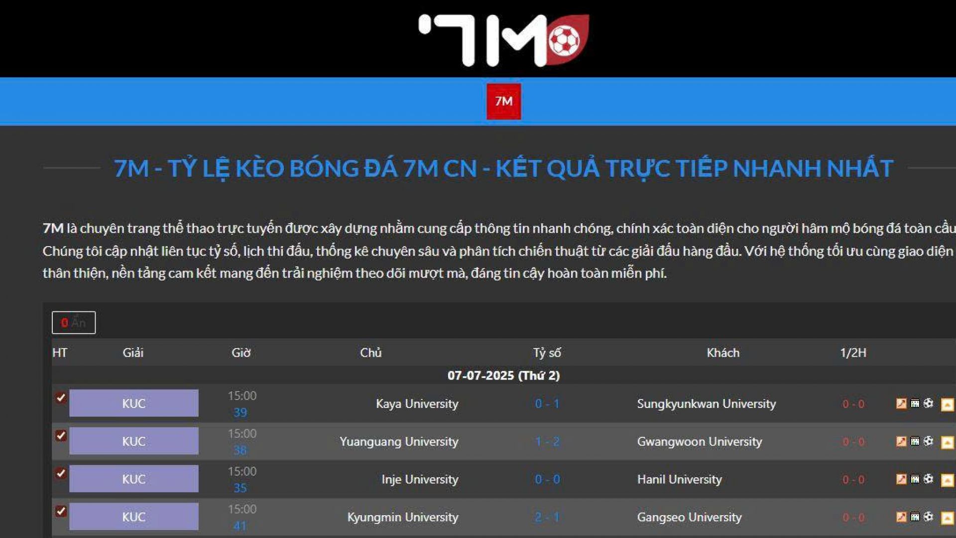 7M là nền tảng thể thao trực tuyến hàng đầu, nổi bật với khả năng cập nhật dữ liệu theo thời gian thực, mang đến trải nghiệm toàn diện cho người hâm mộ bóng đá và cá cược.