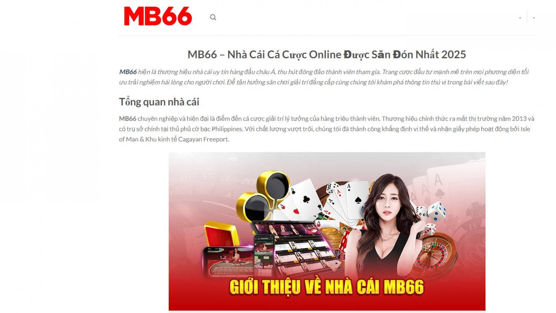 MB66 là một trong những sân chơi online uy tín hàng đầu tại châu Á, được ra mắt từ năm 2013 và có trụ sở chính tại Philippines. Địa chỉ: 117 Lý Chiêu Hoàng, Phường 10, Quận 6, Hồ Chí Minh, Việt Nam. Phone: 0845546064. Email: info@mb66.cam. Website: https://mb66.cam/ #mb66 #trangchumb66 #dangkymb66 #dangnhapmb66 #linkmb66